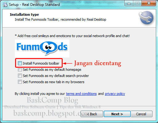 - Penawaran untuk mendownload atau menginstal software atau komponen (Facemoods, Bing Toolbar dan Complitly). Program ini tidak perlu ikut diinstal karena tidak berpengaruh terhadap fungsi utama software. (Jangan centang kotak "Install Funmoods toolbar" dan "Yes, I want speed up my search")